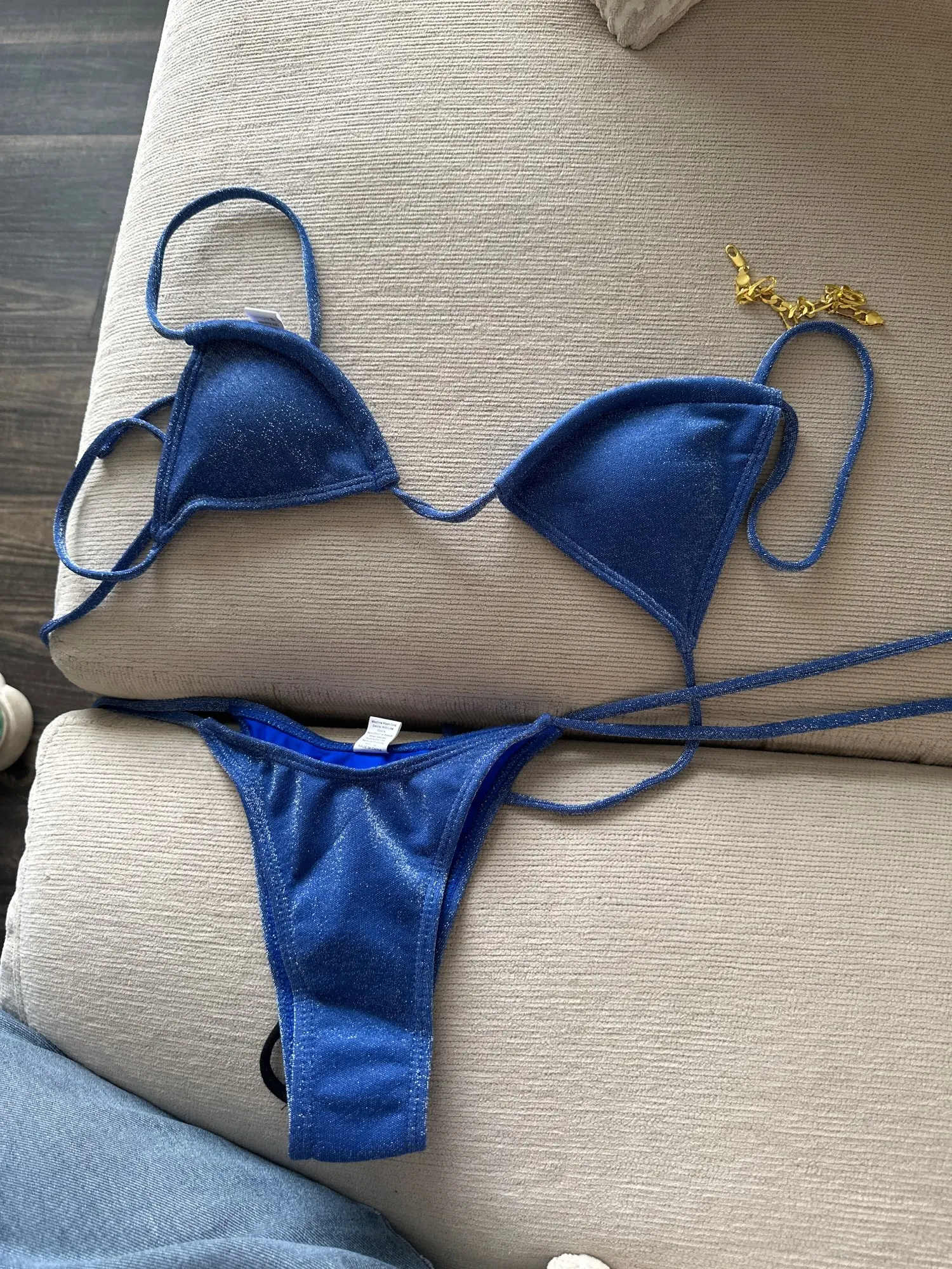 Shine bright this summer in the Miyouj Shiny Bikini Set, a stunning two-piece swimsuit designed to turn heads. This triangle bikini features a sleek, shimmering fabric that enhances your glow under the sun. The adjustable bandage-style straps ensure a perfect, secure fit, giving you confidence whether you're at the beach or poolside.