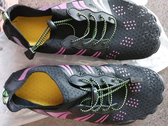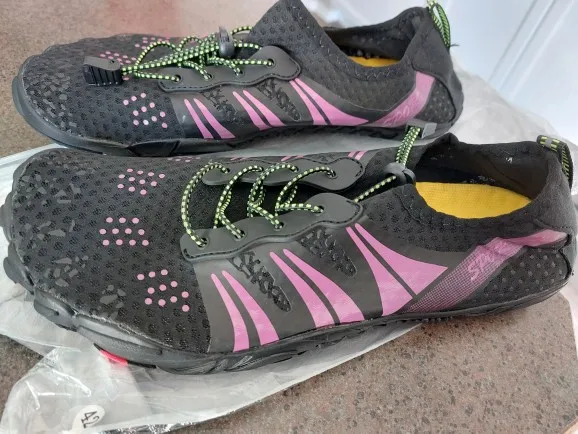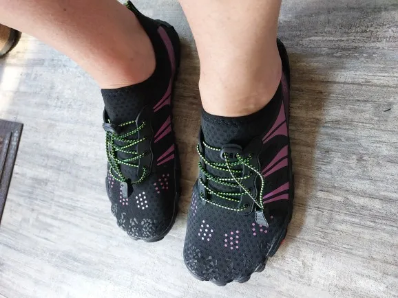 These water shoes fit true to size, are stretchy and fit nice arouns rhe ankle like a sock, have a thick flexible rubber sole so that you don't feel rocks under your feet when walking, and are very light weight and comfortable, and stylish!